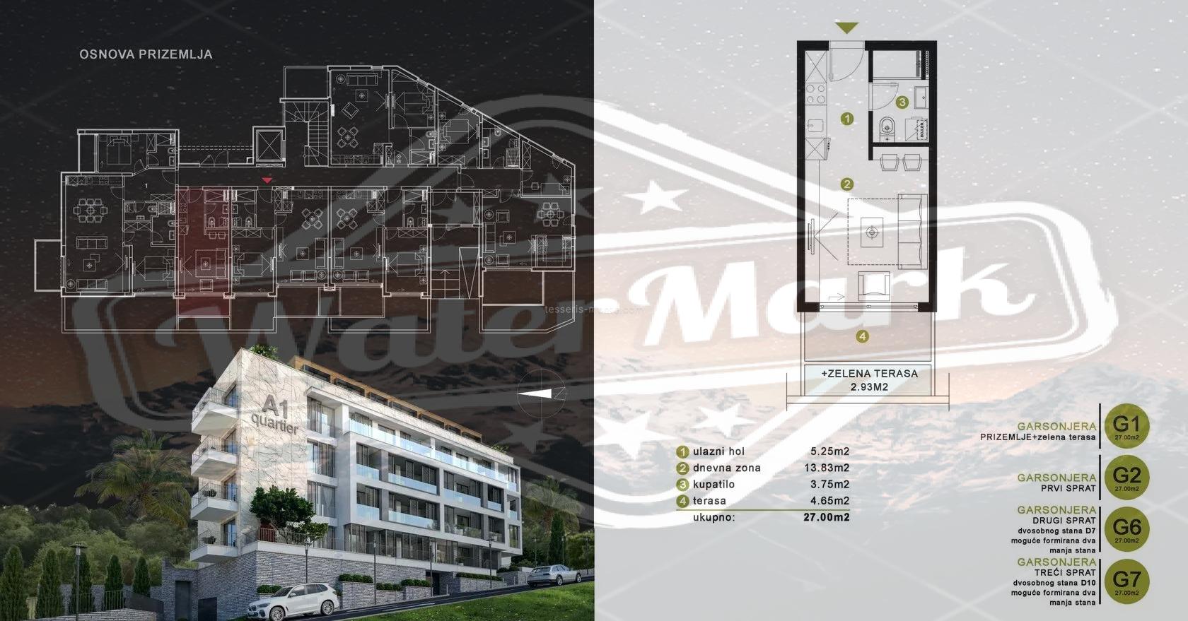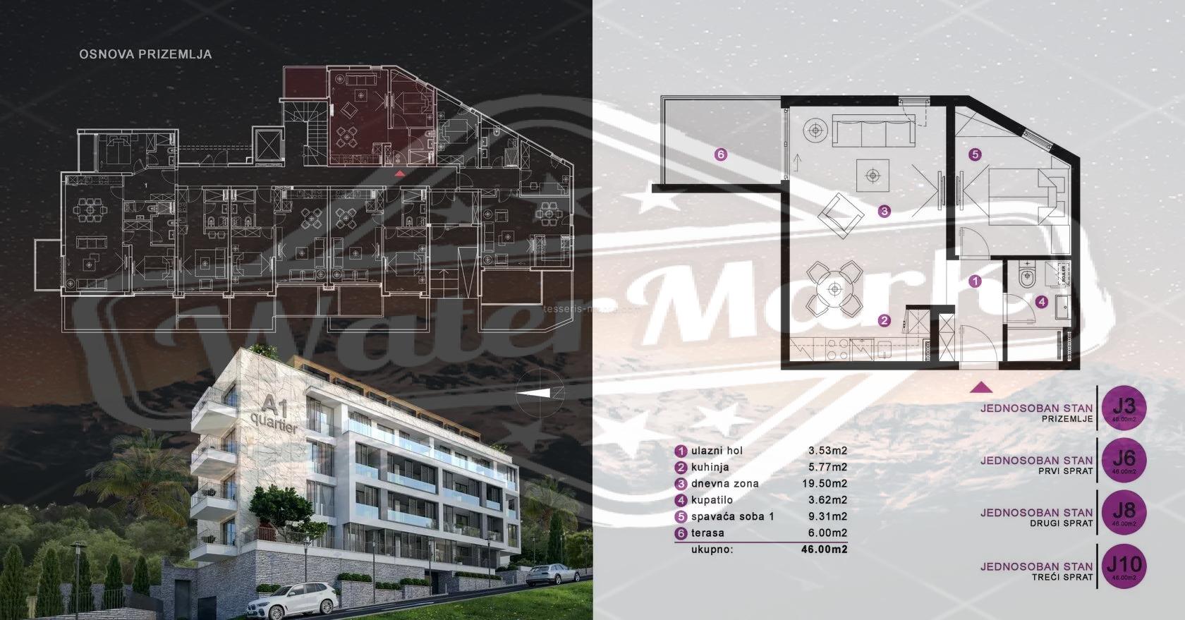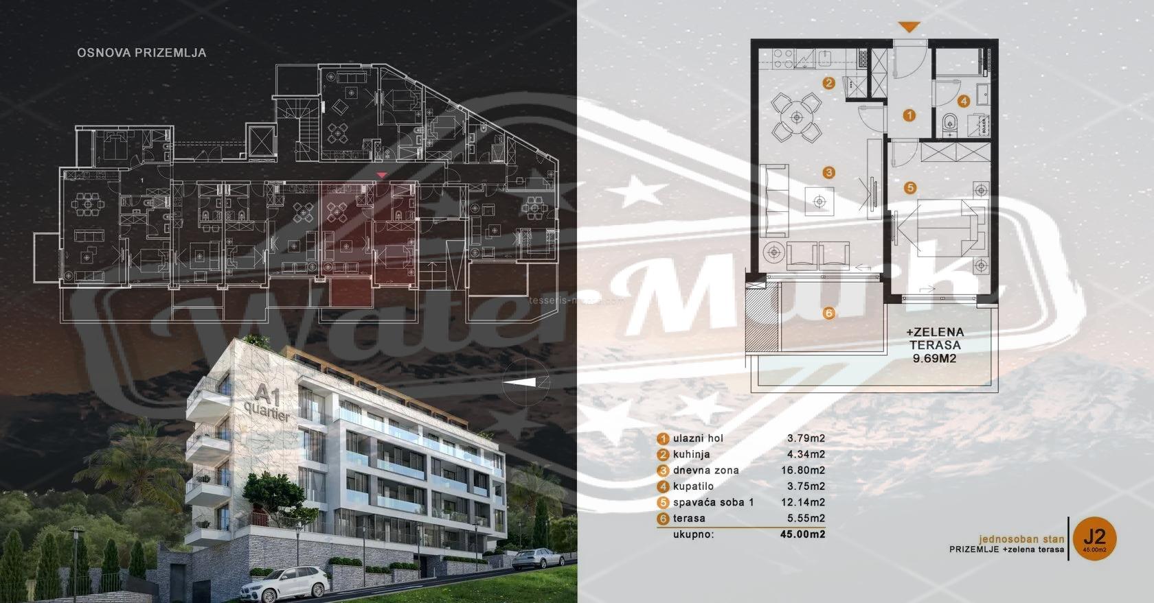 Пятиэтажный дом с двухуровневым гаражом. Современный проект предусматривает квартиры-студии, квартиры с одной и двумя спальнями. Большинство квартир имеют вид на море. Площади от 27 м2 до 76 м2. На верхнем этаже расположены два пентхауса площадью 138 м2 и 146 м2. Цены от 2200 евро/м2.