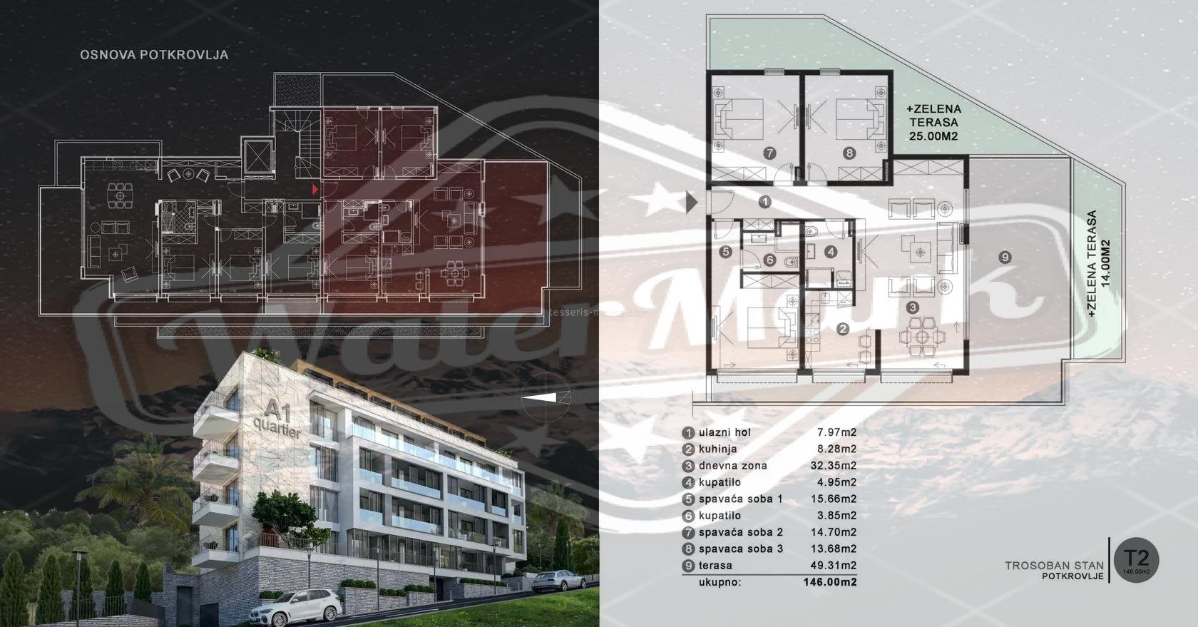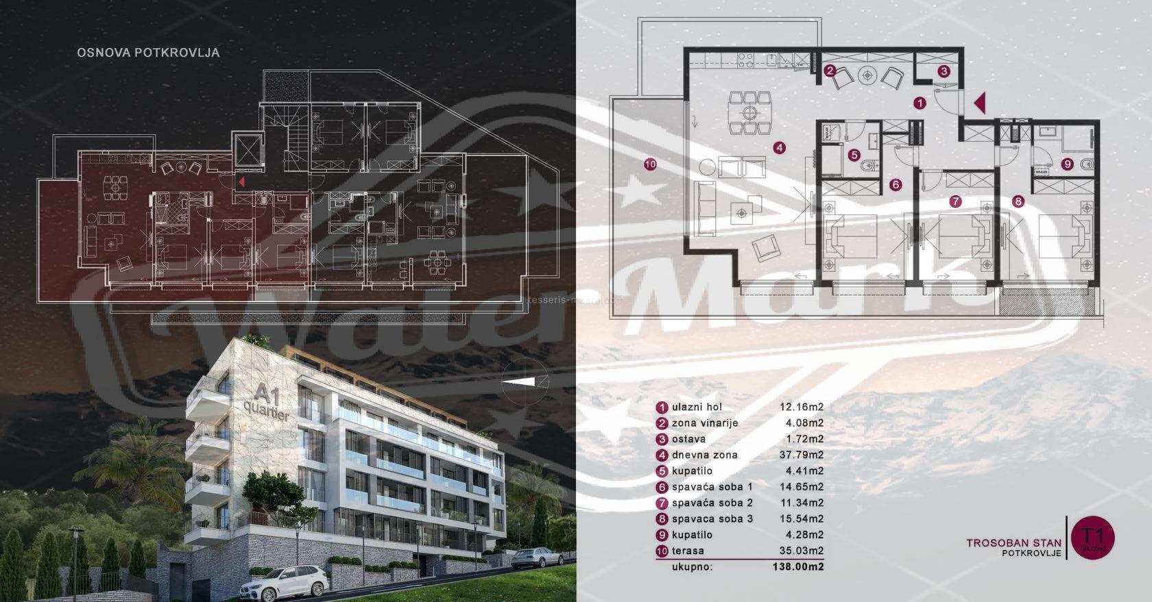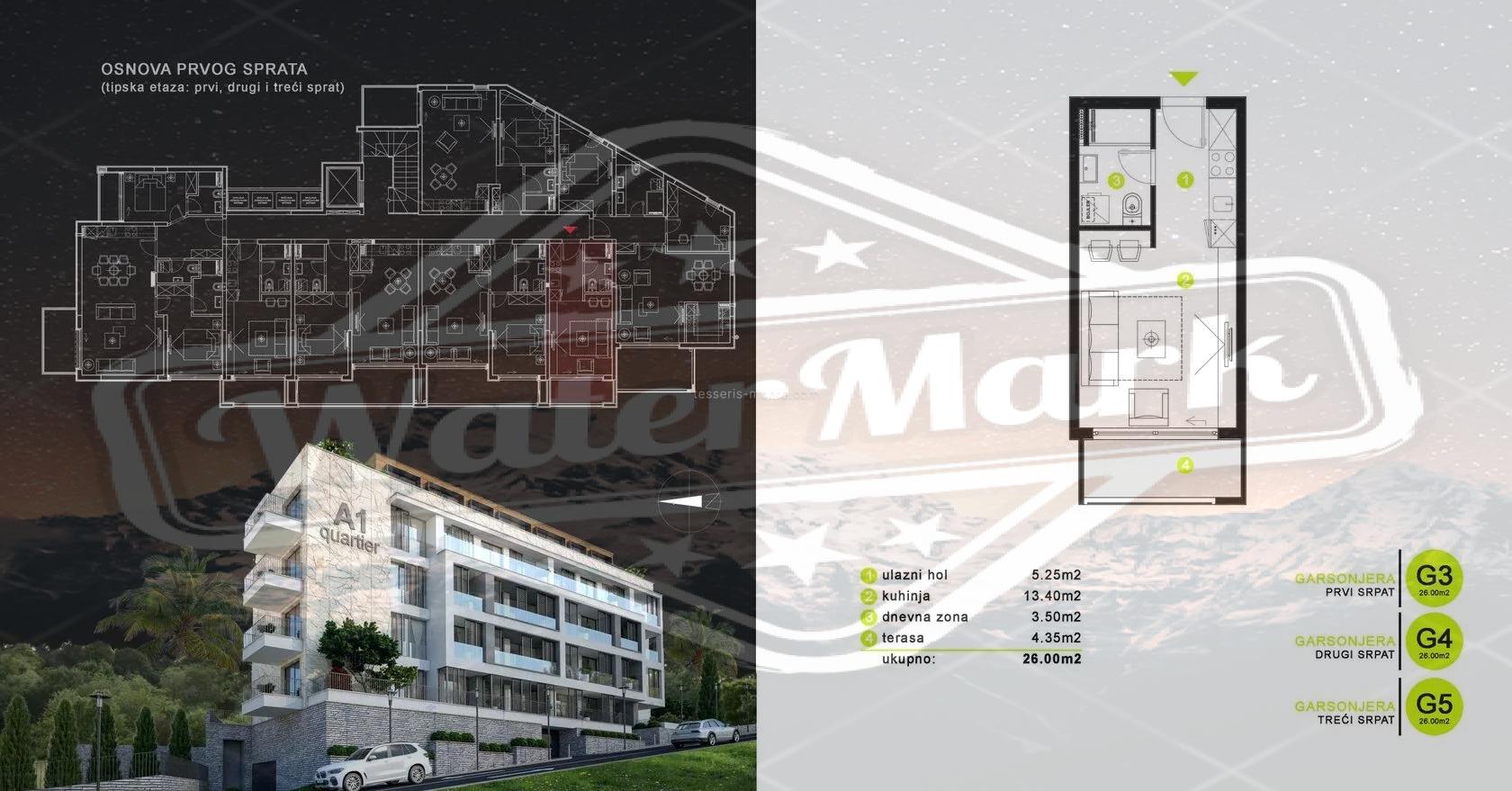 Пятиэтажный дом с двухуровневым гаражом. Современный проект предусматривает квартиры-студии, квартиры с одной и двумя спальнями. Большинство квартир имеют вид на море. Площади от 27 м2 до 76 м2. На верхнем этаже расположены два пентхауса площадью 138 м2 и 146 м2. Цены от 2200 евро/м2.