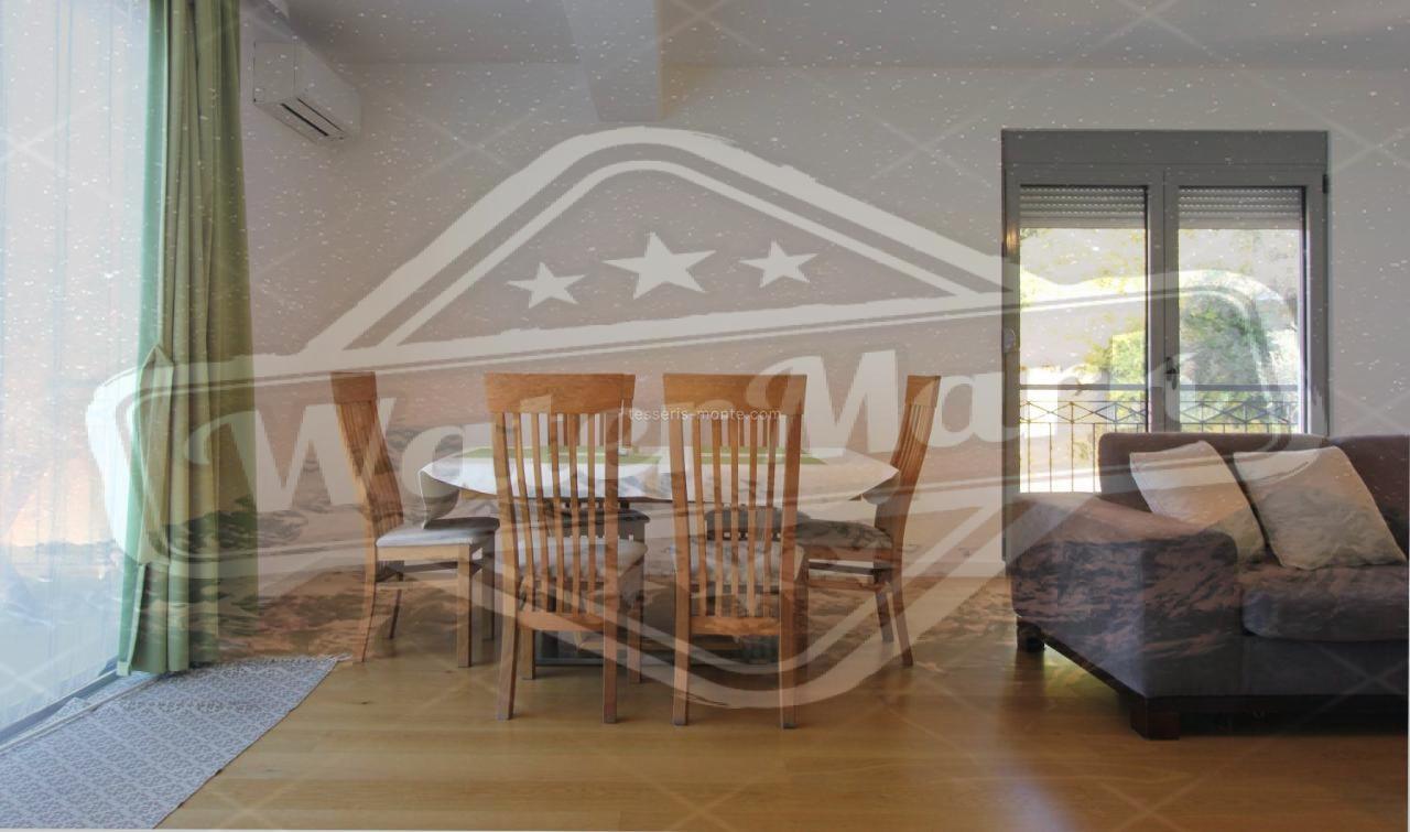 Укупне површине 110м2 састоји се од две спаваће собе, два купатила, дневног боравка, опремљене кухиње са машином за прање судова и рерном, балкона и приватног гаражног места. Нова модерна кућа. Са терасе се пружа прекрасан панорамски поглед на море и планине.
