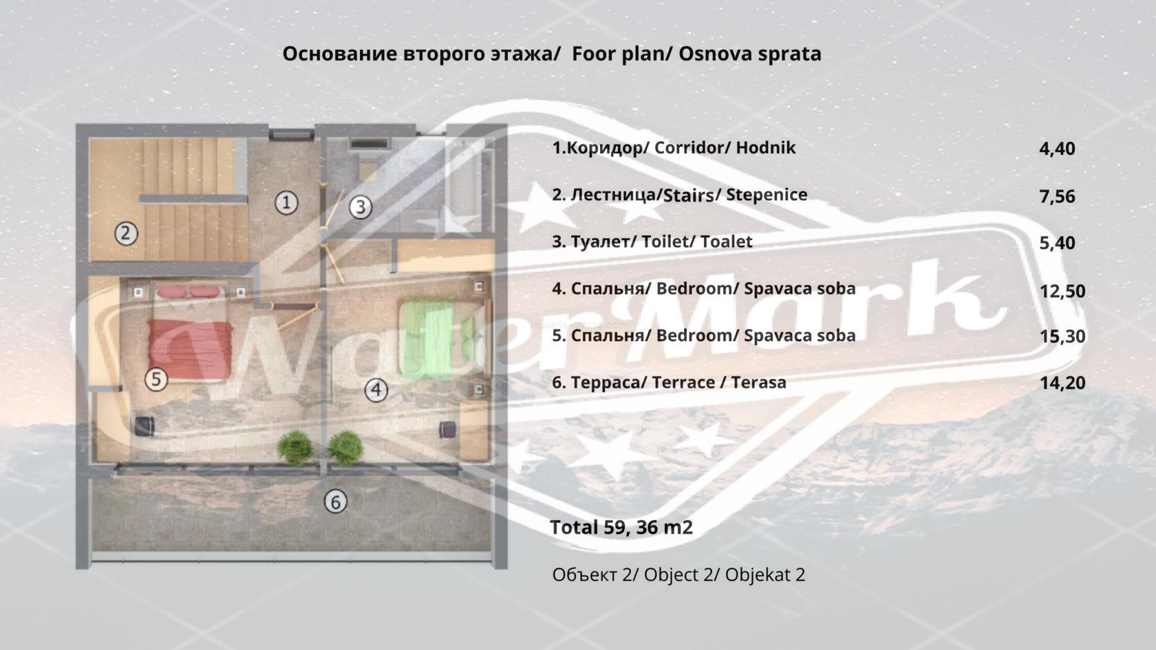 - Други спрат: две спаваће собе, купатило, тераса