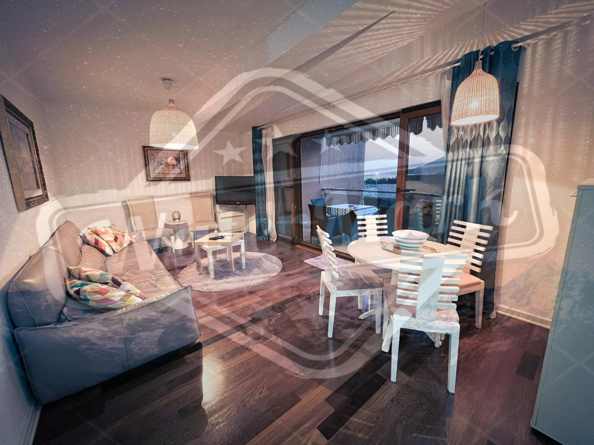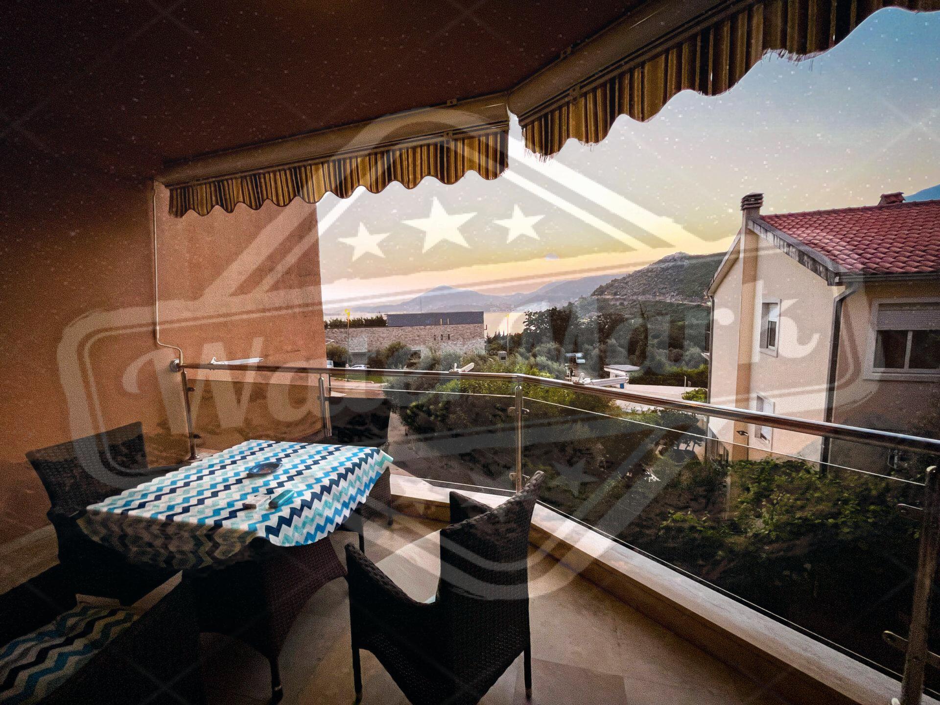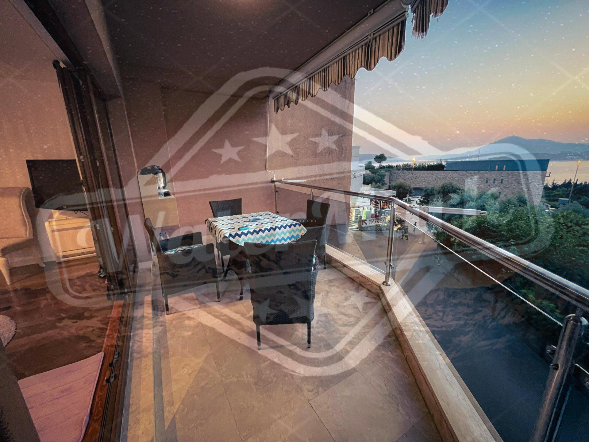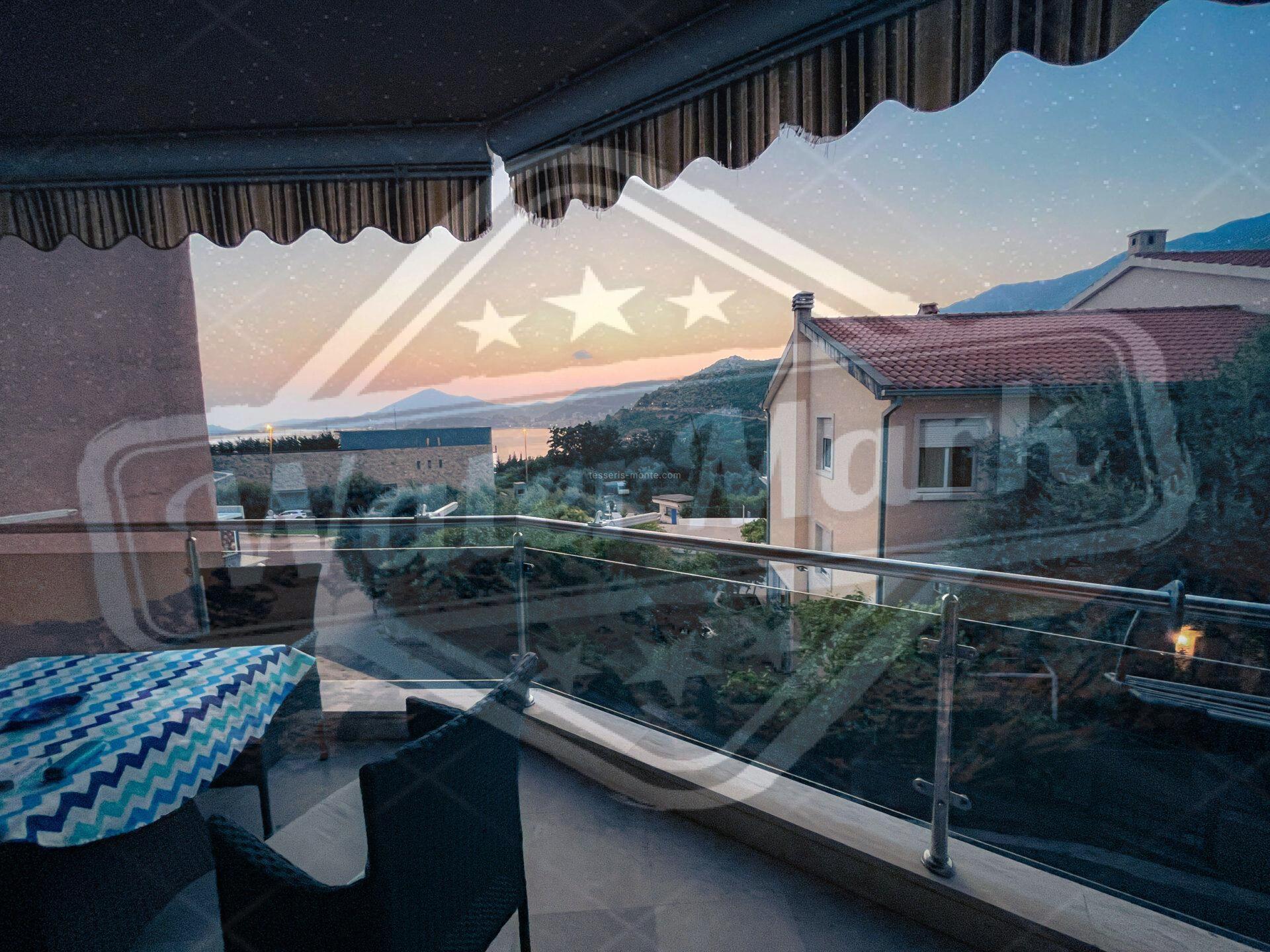 Површина стана 57м2, налази се у високом приземљу. Има диван поглед на море и на планине.