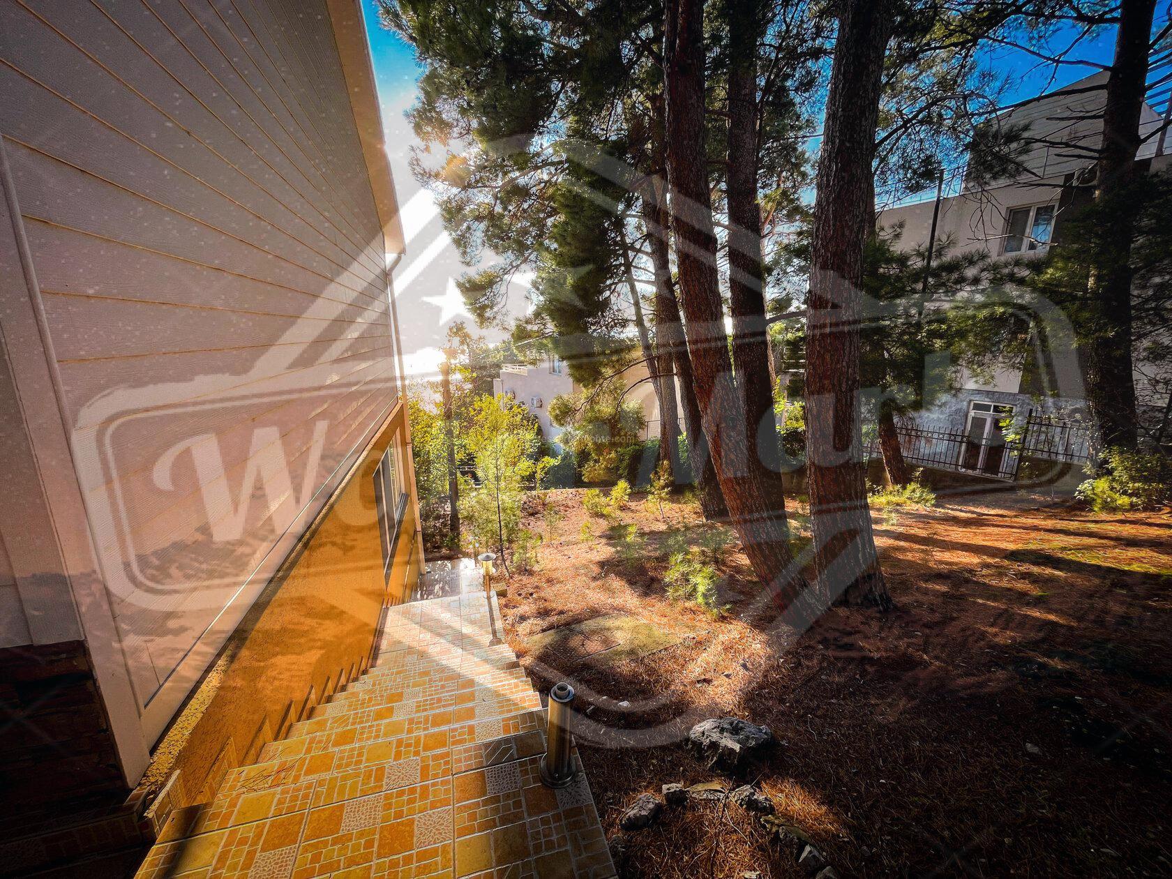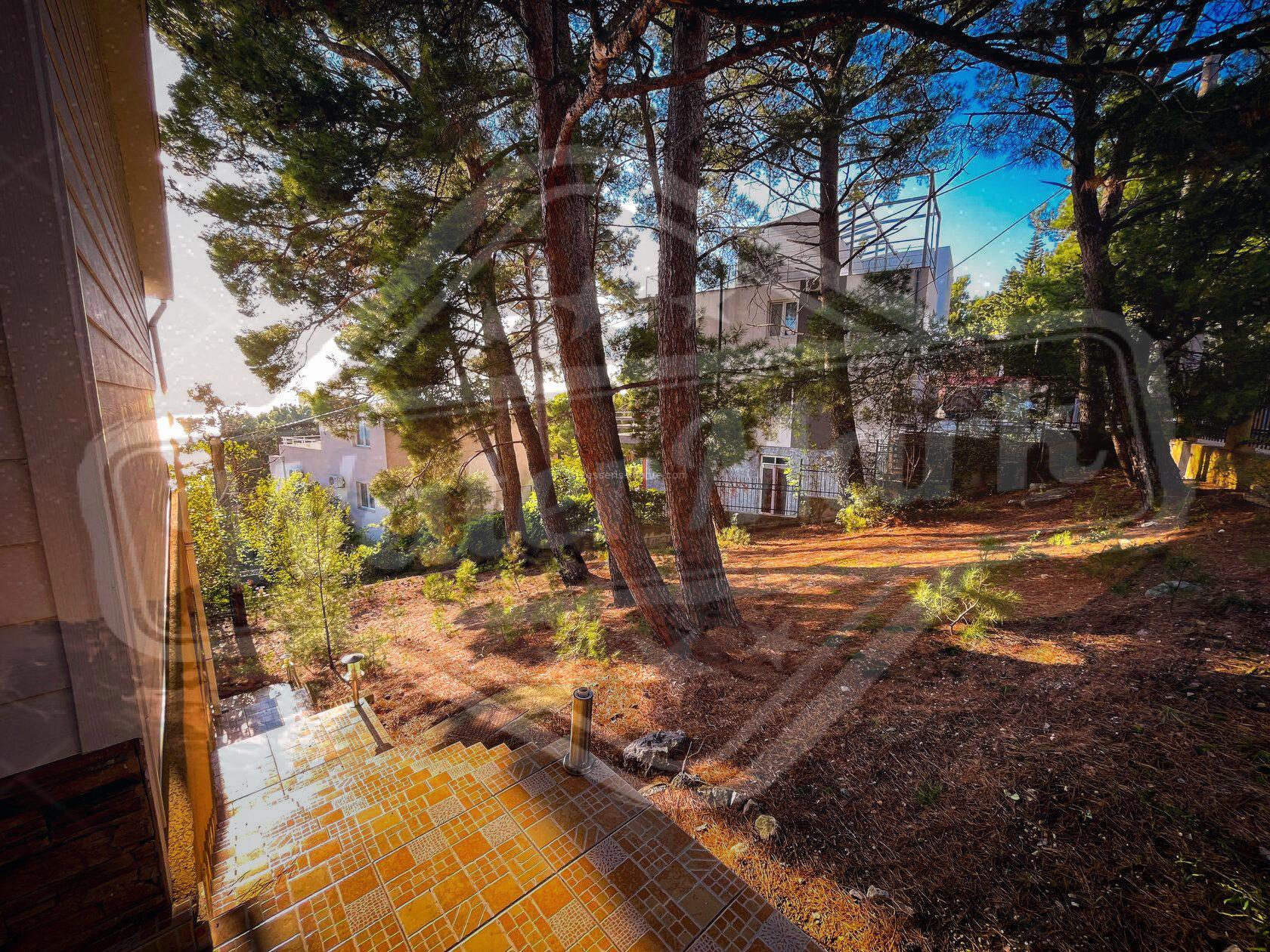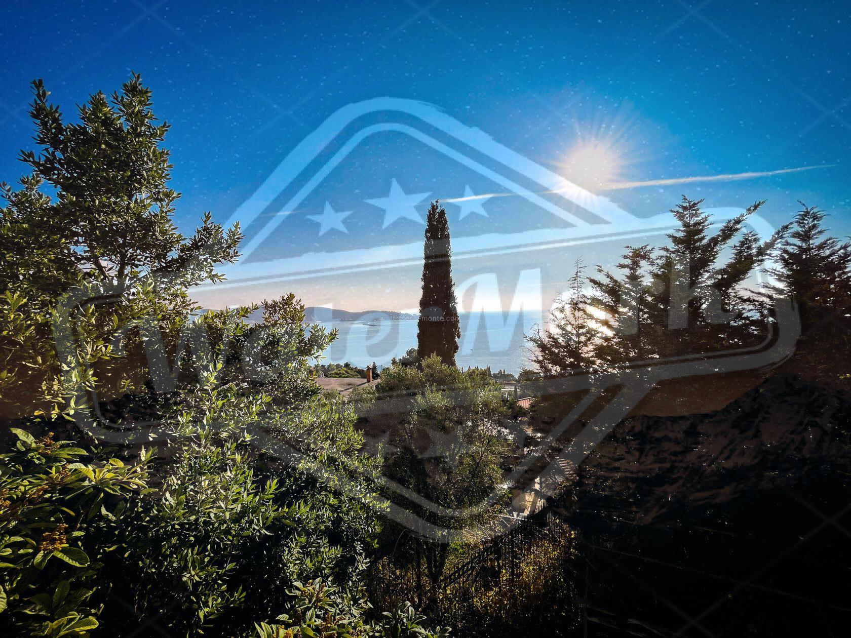 Кућа је окружена четинарским дрвећем са погледом на море.