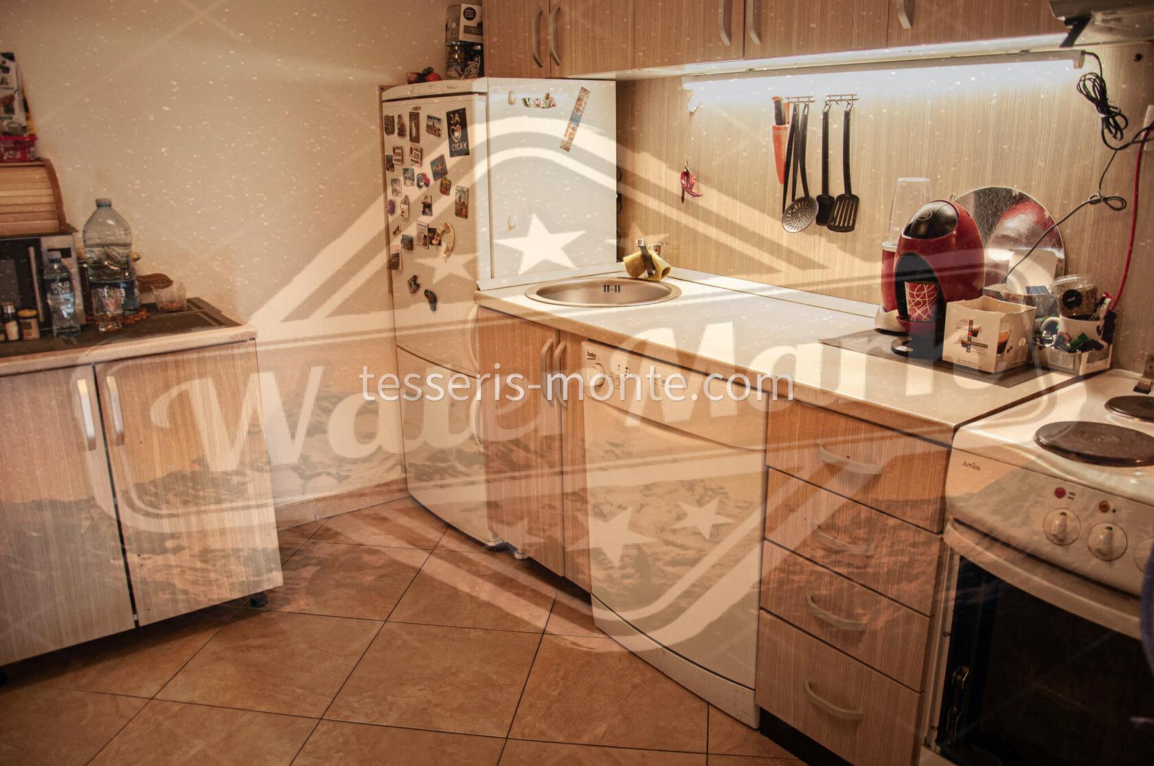 Кухня відокремлена від вітальні перегородкою. Встановлено всю необхідну кухонну техніку, в тому числі й посудомийну машину.