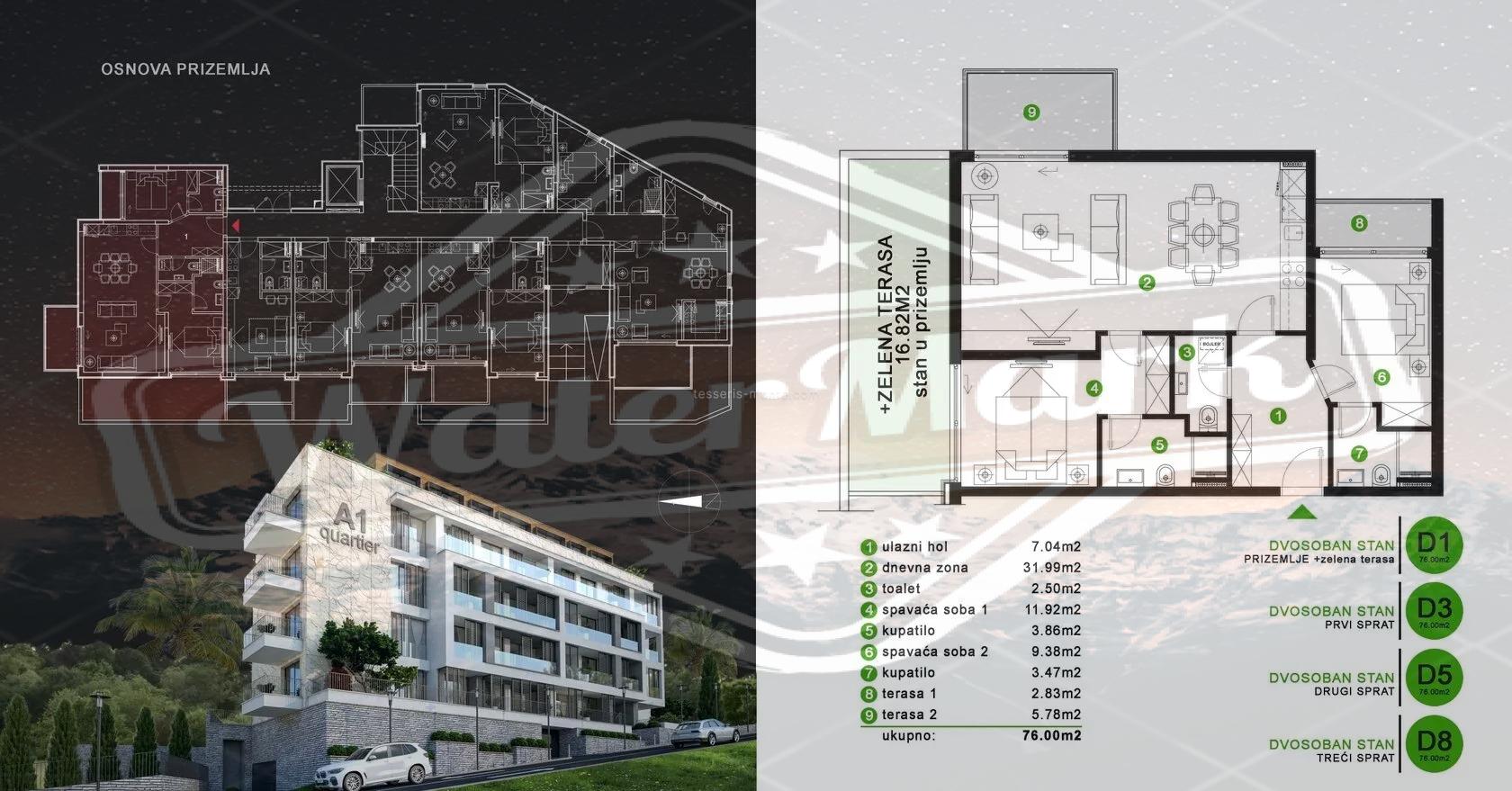 Площа 76м2. Квартира знаходиться на першому чорногорському поверсі. Передбачено ліфт.