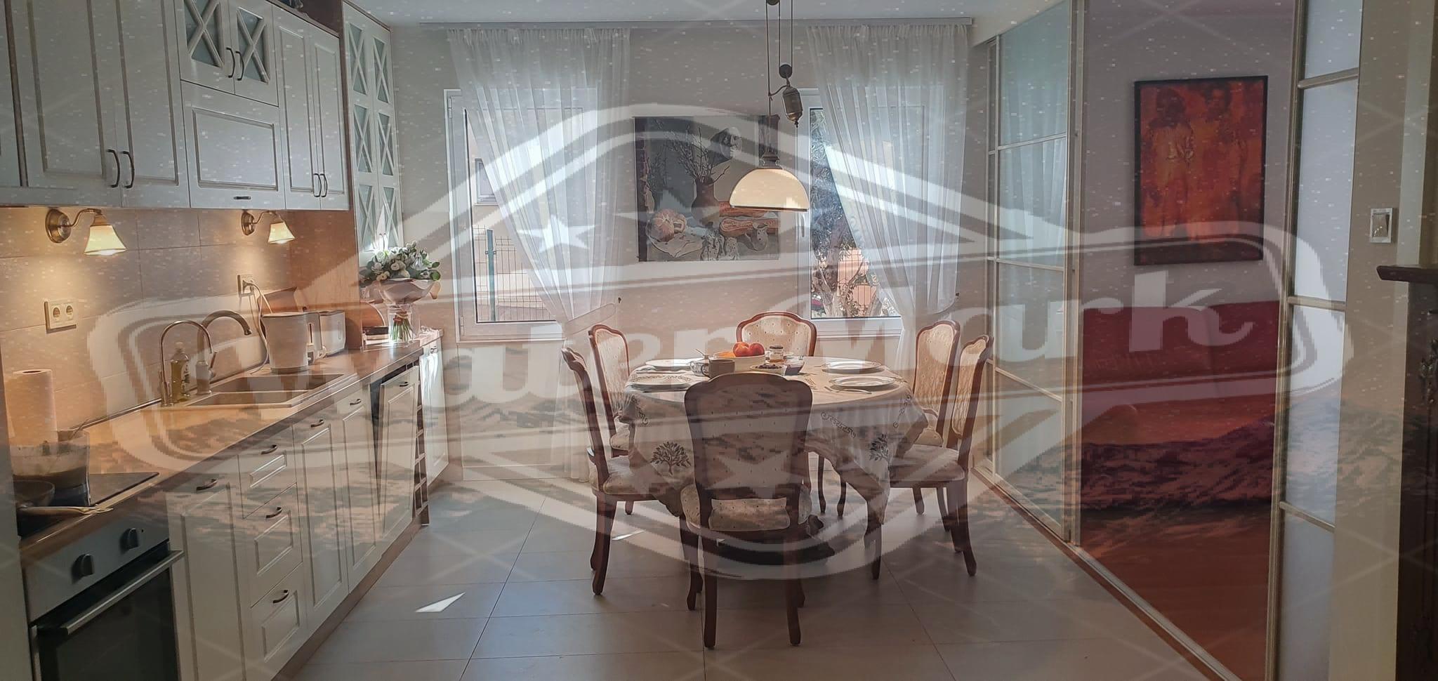 2. Кухня-їдальня 25 кв.м зі зробленими на замовлення меблями та вбудованою технікою, тепла підлога, посудомийна машина, питні фільтри, шафа для зберігання круп та ящики для овочів, чайник, тостер, хлібопічка, вафельниця, повний набір посуду.